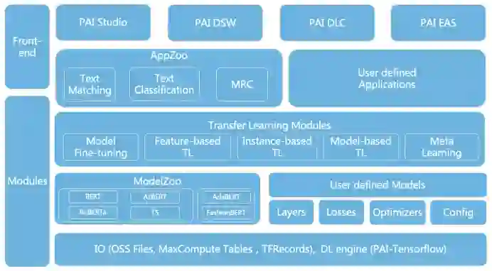 同时,经过了阿里内部 10 多个 BU,20 多个业务场景打磨,给 NLP 和迁移学习用户提供了多种便利,包括业界领先的高性能预训练工具链和预训练 ModelZoo,丰富易用的 AppZoo,高效的迁移学习算法,以及全面兼容阿里巴巴 PAI 生态产品,给用户提供一个从模型训练到部署的一站式服务。