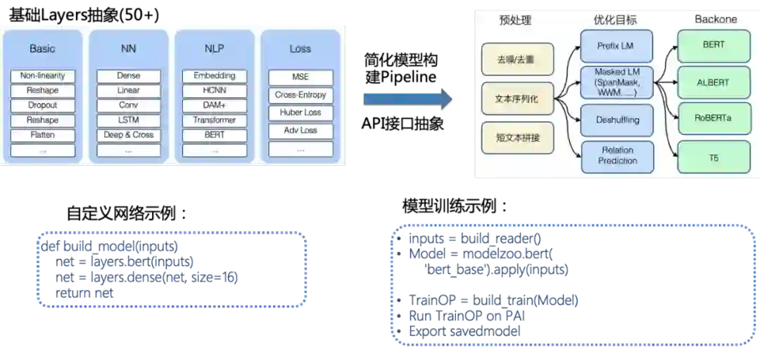 丰富且高质量的预训练模型 ModelZoo:支持 PAI-ModelZoo,支持 Bert,Albert,Roberta,XLNet,T5 等主流模型的 Continue Pretrain 和 Finetune。同时支持自研的多模态模型服装行业的 Fashionbert 等;