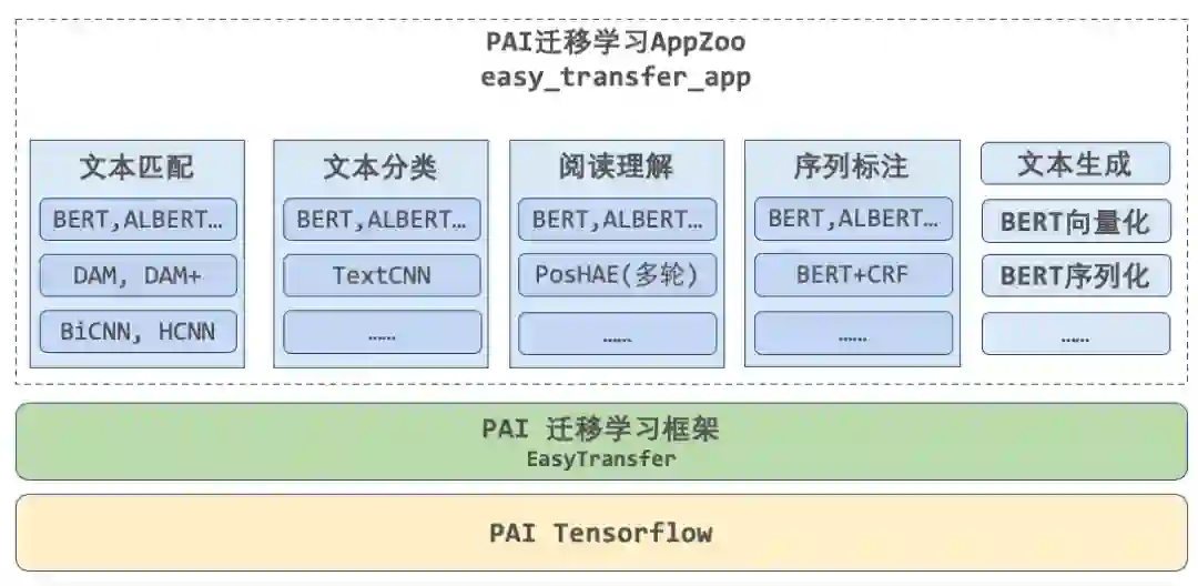 EasyTransfer 封装了高度易用、灵活且学习成本低的 AppZoo,支持用户在仅用几行命令的条件下 “大规模” 运行 “前沿” 的开源与自研算法,即可迅速接入不同场景和业务数据下的 NLP 应用,包括文本向量化、匹配、分类、阅读理解和序列标注等。