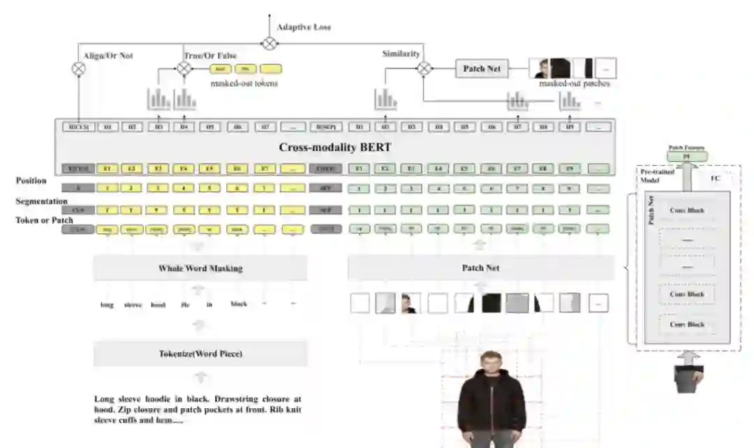 随着 Web 技术发展,互联网上包含大量的多模态信息,包括文本,图像,语音,视频等。从海量多模态信息搜索出重要信息一直是学术界研究重点。多模态匹配核心就是图文匹配技术(Text and Image Matching),这也是一项基础研究,在非常多的领域有很多应用,例如 图文检索(Cross-modality IR),图像标题生成(Image Caption),图像问答系统(Vision Question Answering), 图像知识推理(Visual Commonsense Reasoning)。但是目前学术界研究重点放在通用领域的多模态研究,针对电商领域的多模态研究相对较少。基于此,我们和阿里 ICBU 团队合作提出了 FashionBERT 多模态预训练模型,针对电商领域的图文信息进行预训练的研究,在多个跨模态检索和图文匹配等业务场景都有成功的应用。模型架构图如下所示。该工作提出了 Adaptive Loss,用于平衡图文匹配,纯图片,和纯文本三部分 loss。