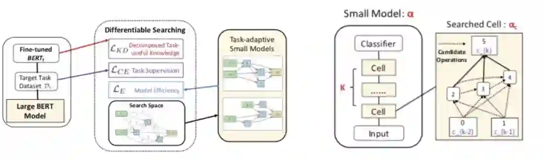 自动知识蒸馏工具:支持知识蒸馏,可以从大的 teacher 模型蒸馏到小的 student 模型。集成了任务有感知的 BERT 模型压缩 AdaBERT,采用了神经网路架构搜索去搜索出任务相关的架构去压缩原始的 BERT 模型,可以压缩最多到原来的 1/17,inference 最多提升 29 倍,且模型效果损失在 3% 以内;