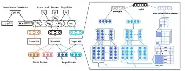 早在 2017 年,我们就在阿里小蜜问答场景里面尝试了迁移学习,我们主要侧重于 DNN based Supervised TL。这类算法主要有两种框架,一个是 Fully-shared(FS),另外一个是 Specific-shared(SS)。两者最大的差别是前者只考虑了 shared representation,而后者考虑了 specific representation。通常来说 SS 的模型效果比 FS 效果好,因为 FS 可以看作是 SS 的一个特例。对于 SS 来说,最理想的情况下是 shared 的部分表示的是两个领域的共性,specific 的部分表示的是特性。然而往往我们发现要达到这样的效果很难,于是我们考虑用一个 adversarial loss 和 domain correlation 来协助模型学好这两部分特征。基于此,我们提出了一个新的算法,hCNN-DRSS,架构如下所示: