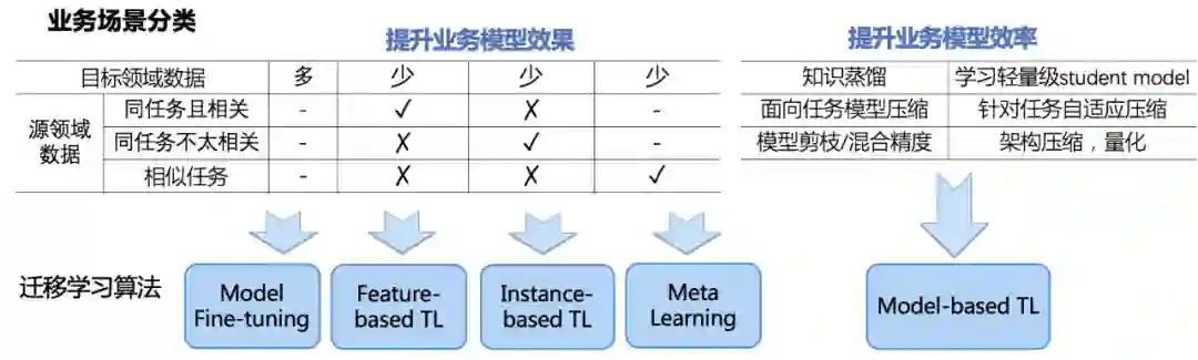 EasyTransfer 框架支持所有主流的迁移学习范式,包括 Model Fine-tuning, Feature-based TL, Instance-based TL, Model-based TL 和 Meta Learning。基于这些迁移学习范式开发了 10 多种算法,在阿里的业务实践中取得了良好效果的效果。后续所有的算法都会开源到 EasyTransfer 代码库里。在具体应用的时候,用户可以根据下图来选择一种迁移学习范式来测试效果。