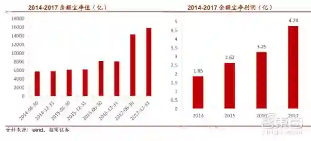 用户规模的快速增长使得余额宝的规模高速增长,从2014年底的5789亿增长到2017年底的 1.58万亿,年复合增长率达到39.72%(同期国内排名第二的货币基金融通汇财宝规模仅为 282.8 亿元,余额宝是其 55.83 倍)。余额宝的净利润总额也从 2014 年底的 1.85 亿元上升到 2017 年底的 4.74 亿元,年复合增长率 36.84%。