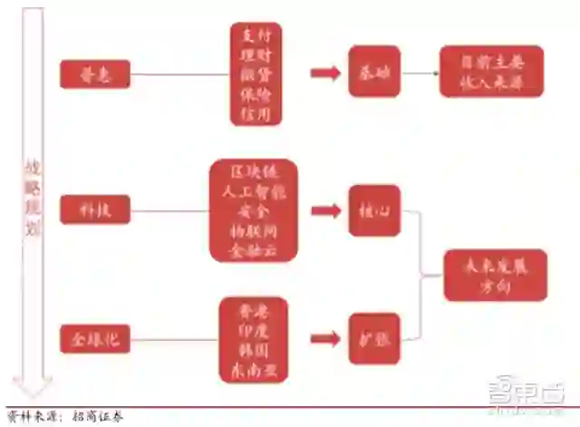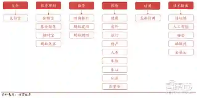目前,蚂蚁金服已形成支付、理财、微贷、保险、征信、技术输出为主的六大业务板块,以及普惠金融、科技、全球化为首的三大发展战略。