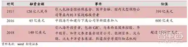 从 2015 年完成将近 18.5 亿的 A轮融资,估值 300 亿美元开始,蚂蚁金服的估值一路水涨船高。2018 年 6 月 8 日,蚂蚁金服宣布完成 140 亿美元的 C 轮融资,市场给出的估值普遍超过 1500 亿美元,位列中国独角兽之首。