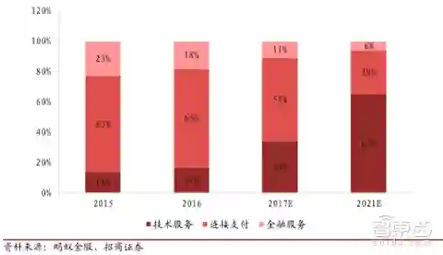 蚂蚁金服目前确立了以 BASIC 技术(区块链、人工智能、安全、物联网、金融云)为核心的战略发展方向,持续不断地从 Fin 向 Tech 转型。预计到 2021年时,蚂蚁金服的技术服务收入将上升至总收入的 65%,超过支付收入成为第一大收入项。