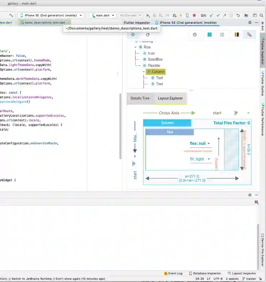 请注意新出现的 Layout Explorer,您可以在代码旁使用该功能。要启用此选项,请使用 Preferences > Languages & Frameworks > Flutter > Enable embedded DevTools inspector。