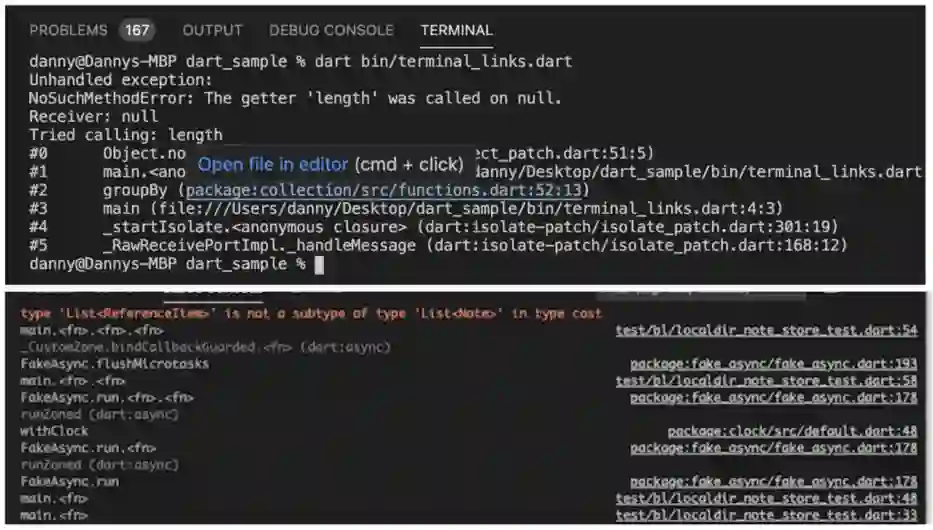 对于所有 Flutter 开发者而言,在终端或堆栈分析结果中查看错误输出并继续解决问题都是一项必不可少的例行工作。在 Visual Studio Code 的最新版本 Flutter 扩展中,现已能够正确解析这些链接,使您可以直接在输出结果中使用它们。