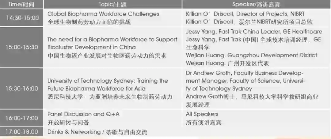 众所周知,未来十年中国将在生物制药的生产和消费领域扮演重要角色。如果中国生物制药市场持续快速发展,源源不断的人才输送不可缺少。生物制药企业需要从现在起投资教育和职业发展项目,建立与未来劳动力的联系渠道,以确保企业的可持续发展。此次专题研讨会将由爱尔兰国家生物加工研究及培训学院NIBRT主导。NIBRT是一家提供生物加工领域职业培训和研究的国际机构,总部位于都柏林,致力于提供独特的培训课程以助力生物制药行业发展。 这是NIBRT首次将丰富经验带来中国进行分享。研讨会将包含NIBRT及其合作伙伴带来的劳动力现状及案例分析等丰富内容。