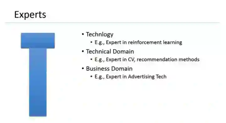 第二,某一技术领域的专家。比如说CV是一个技术领域,这个领域里有很多特定的算法,虽然我不是某一特定算法的专家,但是我都了解,更关键的是我可以利用这些成熟的算法解决特定的业务问题,这也是一类专家;例如推荐系统也是一个领域,也可以成为这个领域的专家。