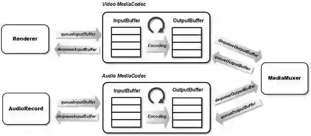 里边有使用的框架。这个组合可以实现很多功能,比如音视频文件的编辑(结合 MediaExtractor),用 OpenGL 绘制 Surface 并生成 MP4 文件,屏幕录像以及类似 Camera App 里的录像功能(虽然这个用 MediaRecorder 更合适)等。