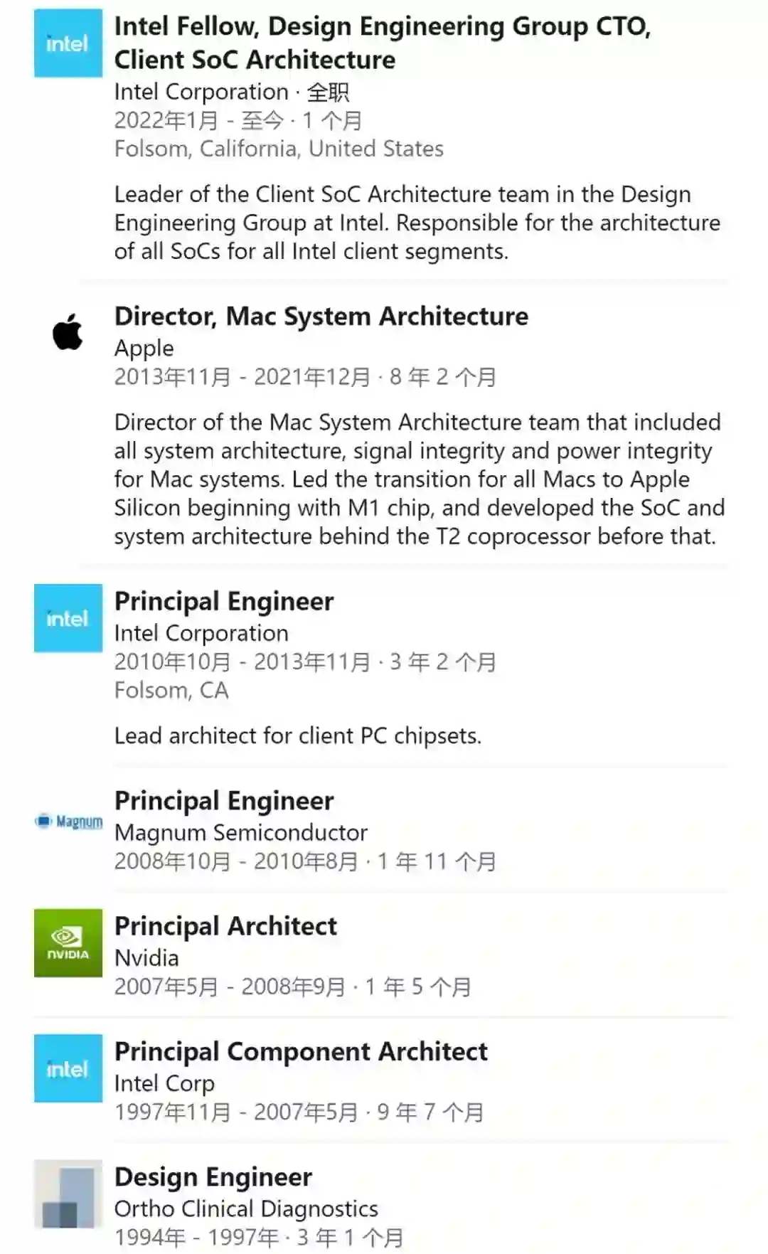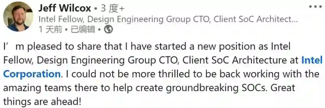 据他在 LinkedIn 上介绍,他已经在英特尔就职,担任英特尔院士(Intel Fellow)、设计工程事业群(Design Engineering Group)CTO,并负责客户端 SoC 架构设计。他表示,「我非常高兴能与英特尔出色的团队再次合作,并共同创建突破性的 SoC。伟大的事业就在前方。」
