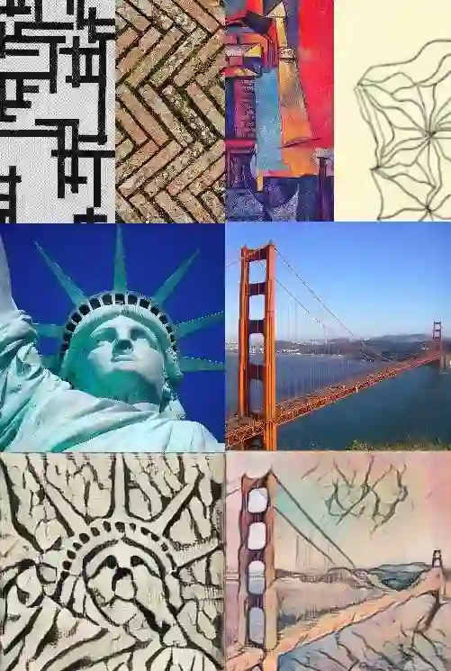 如果硬要说有什么不足,那就是网站的延迟有点高(选取图像/风格后无法及时跳转,也许是水管不行)。此外,在对构图空旷的图像(如加州金门大桥)进行风格迁移时,我们发现粗粝线条风格(如bricks)容易弱化主体线条,使迁移后的图像几乎没有内容。
