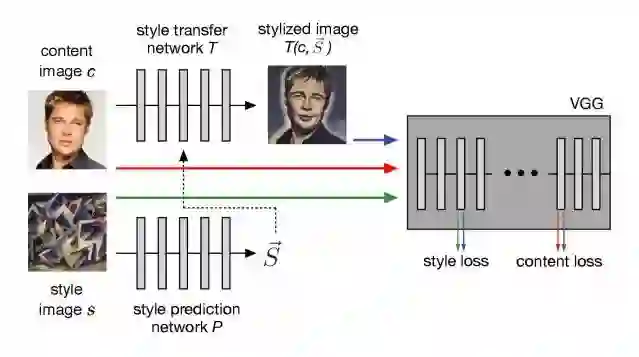 论文作者改进了这一做法。他们在风格迁移网络前添加了一个预测网络P(·),它以任意风格的图像作为输入,并预测归一化常数的嵌入向量→S,这样做的优势是模型能把学到的迁移方法推广到其他图像上。