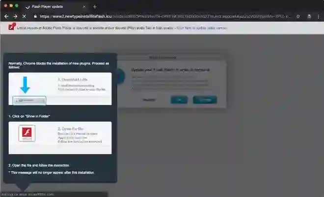 在Mac电脑屏幕上显示Adobe Flash Player需要更新的通知,并敦促用户打开一个试图在浏览器中下载的文件;一旦用户点击下载并运行恶意软件,最终将导致Shlayer木马感染所用Mac电脑。