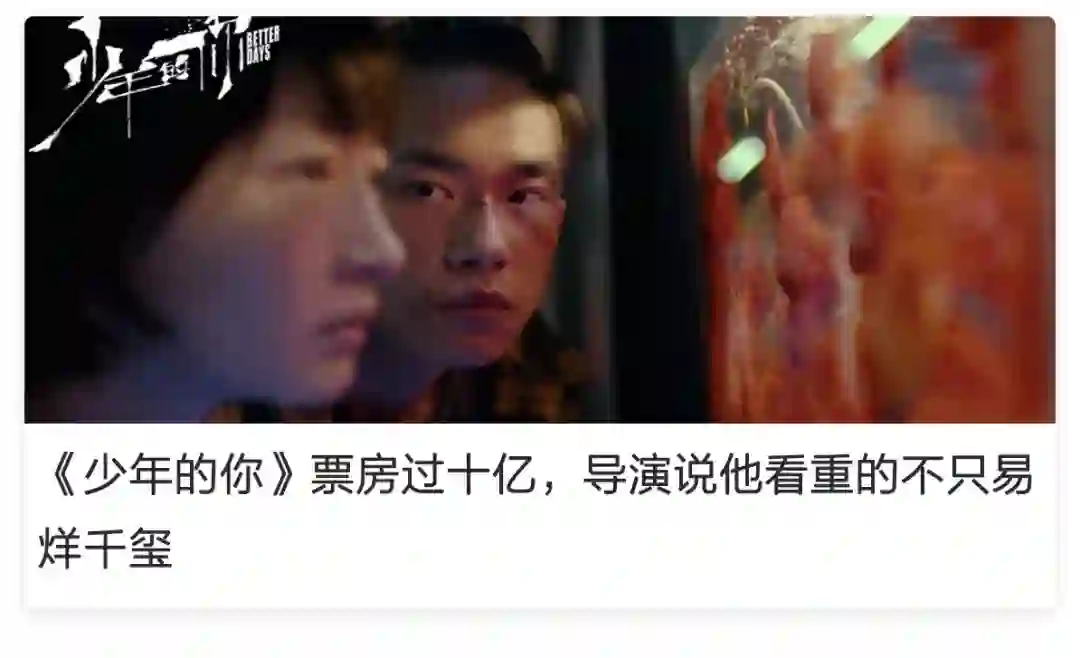 《少年的你》不出意外地爆了,除了易烊千玺那句“你保护世界,我保护你”之外,直面校园暴力等社会现实议题,也是其成功的重要原因。