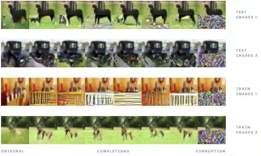 在条件 ImageNet 模型上执行图像补全,该模型展示了图像修补中的多样性。注意输入来自于测试分布,并非模型样本,它表示测试数据的覆盖范围。