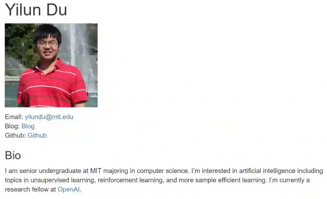 值得注意的是,一作 Yilun Du 还是 MIT 的大四本科生,他从 15 年大一开始就发过 ECCV 16、NIPS 18 等多个大会和 Workshop 的论文,加上这篇论文一共 8 篇。Yilun Du 的工作经验也非常多,他在 Facebook 做过软件工程实习生,目前在 OpenAI 多智能体强化学习团队做研究。Yilun Du 的简历表示,他在 MIT 的 GPA 为 5.0/5.0,这基本上属于学神的领域了。