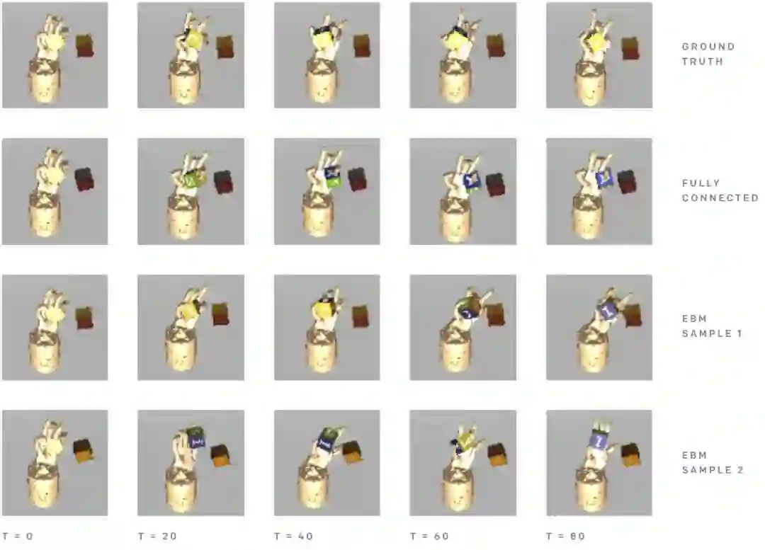 除了生成图像,作者发现基于能量的模型在大量时间步骤上能够生成稳定的机器人动态轨迹。虽然前馈模型不能做均值预测,EBM 却能够生成一系列不同的可能性。