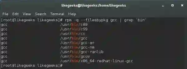 $ rpm -q --filesbypkg gcc | grep 'bin'