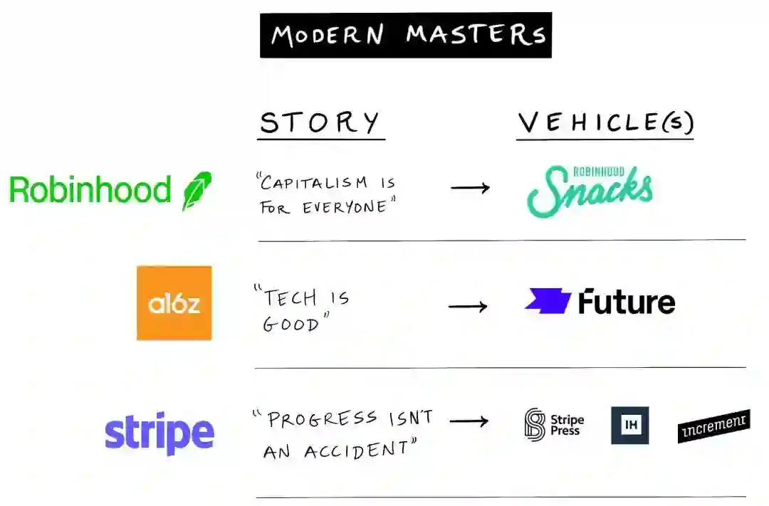 FTX 的大胆举动吸引了媒体关注。它还在美国公众当中建立亲和力、熟悉度和影响力。在《谁讲的故事更好》一文中,我们还确定了其他几家可以被看作是现代软实力大师的公司,其中包括Robinhood 、a16z 以及 Stripe。