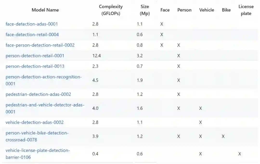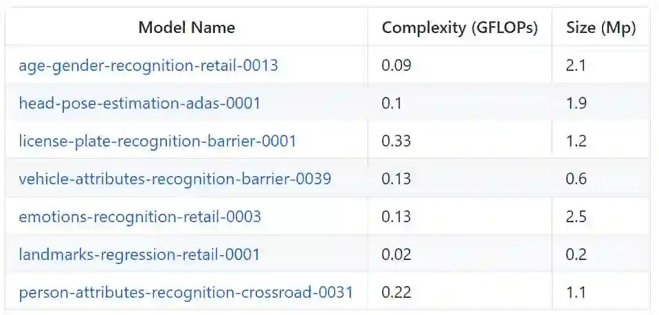 目标识别模型被用于分类、回归和特征识别。可以在使用检测模型之后使用这些网络(例如,在人脸检测之后使用年龄/性别识别)。这个列表包含了年龄/性别、头部姿态、车牌号码、汽车属性、情绪、人脸关键点和人物属性等目标的识别模型。