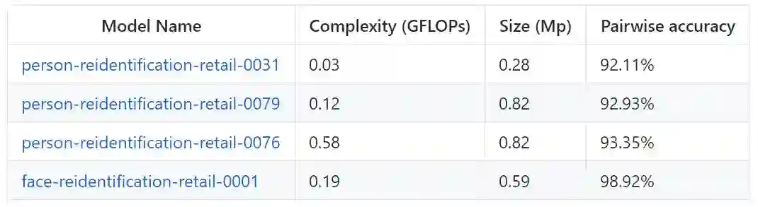 视频中进行目标的精确追踪是计算机视觉的常见应用(例如,人群计数)。以下网络可以用于这样的场景。输入一个人的图像并估计一个表征该人物外观的高维向量。这个向量可以用于进一步评估:对应同一个人的图像会有很接近的向量(基于 L2 距离指标)。以下列表提供了不同准确率/速度权衡的模型选择。列表中包含了人物和人脸再识别任务的模型。