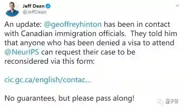 据Jeff Dean透露,图灵奖得主、深度学习三巨头之一、现居加拿大的著名学者Geoffrey Hinton,已经亲自过问此事。加拿大官员告诉Hinton,被拒签的NeurIPS参会者,可以在网上申诉。不过……
