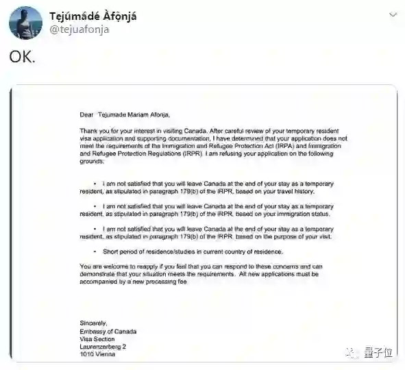 推文的配图才是重点。她晒出的这张图,是一封来自加拿大使馆的信。在这封充满格式化客气措辞的信中,加拿大官员拒绝了Tejumade Afonja的签证申请,理由很简单,旅行历史、移民身份和访问目的表明——她有可能会留在加拿大。