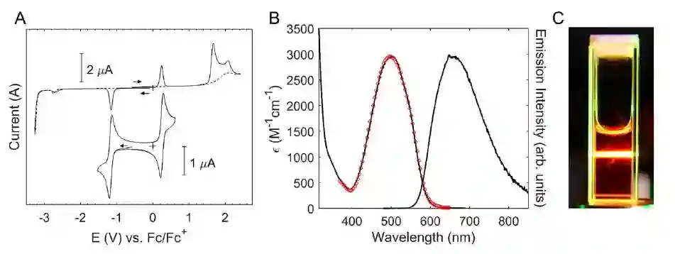 他们首次合成了一种新的铁配合物——[Fe(phtmeimb)2]+。这种铁分子能够表现出强烈可见的室温光致发光,其寿命为 2.0 纳秒,量子产率为 2%。