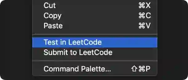 在编辑区内右键并选择 Test in LeetCode,可对当前答案进行测试。