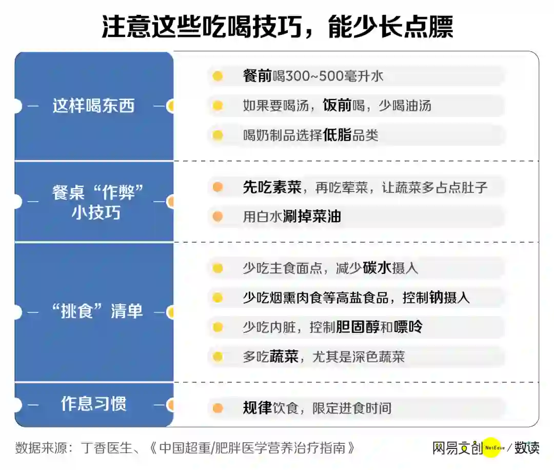 除了吃慢点,餐前喝 300~500 毫升水,以及规律饮食,限定进食时间,比如夜间控制住点宵夜的心,都能让你吃得更少,减少发胖几率。