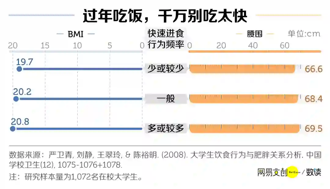 一项针对 1000 多名中国大学生饮食习惯和肥胖关系的研究也表明,吃得慢的人确实会更瘦一些,他们的 BMI (体重指数)平均会比进食速度快的人低 1 个点,腰围也会平均细 3cm。