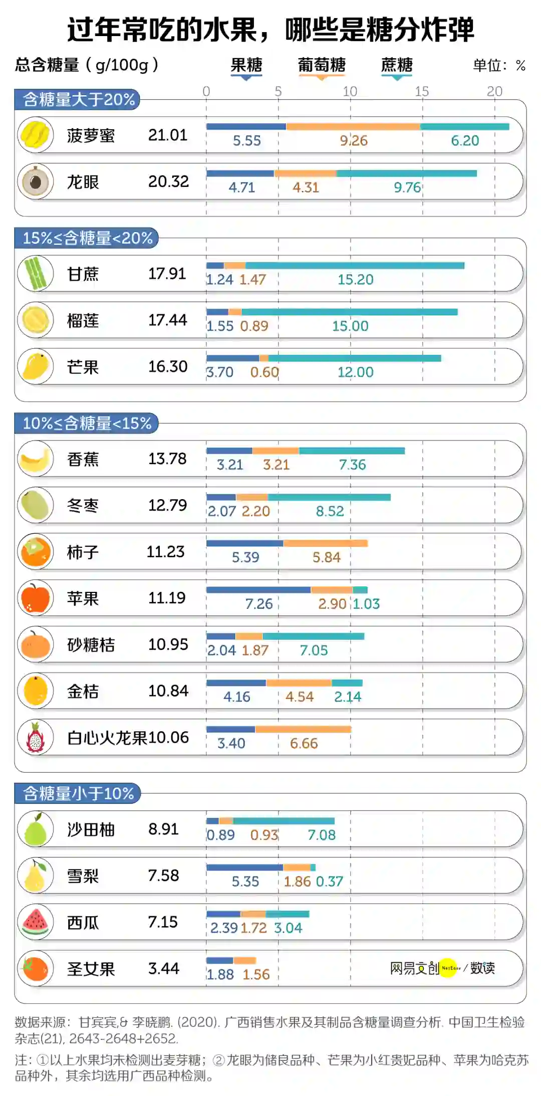 虽然含糖量超过 15% 的大多是热带水果,并非家家户户过年时都常吃,但寓意美好、春节常出现的龙眼(桂圆),含糖量就超过了 20%,绝对应该进入一级警戒名单。