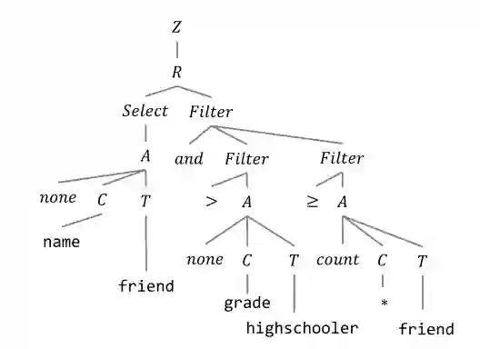 与SyntaxSQLNet类似,IRNet定义了一系列的CFG文法,将SQL转发为语法树结构。可以将其看作一种自然语言与SQL语句间的中间表示(作者称之为SemQL),整个parsing的过程也是针对SemQL进行的。如图所示: