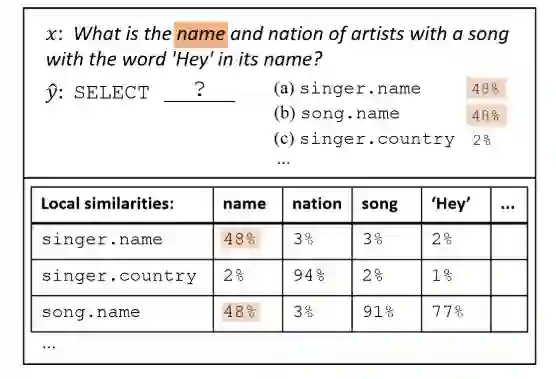 除此之外,该团队还提出了一种基于全局信息重排序的做法。首先先看下面这个例子,我们不知道name到底指向的是singer还是song,但是我们可以观察到nation只在singer中出现,所以应该是singer.name。这样做globalreasoning,就能减小歧义性。