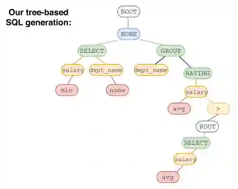 相比于之前decoder输出一段线性的文本,SyntaxSQLNet将解码的过程引入了结构性信息,即解码的对象为SQL语句构成的树结构。通过该技术,模型的精确匹配率提高了14.8%。