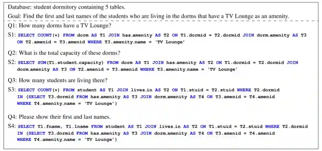 耶鲁大学的研究团队后续又推出了SParC,即Spider的上下文相关版本。数据库基于Spider,模拟了用户进行数据库查询的过程:用户通过若干条相关的提问最后达到一个最终查询目的。