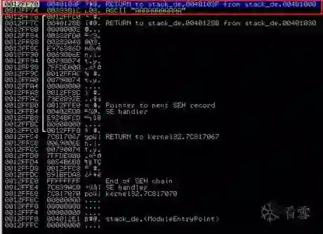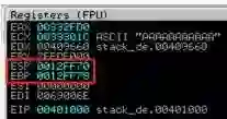 如您所见,执行的第一条指令是MOV ESP,EBP,它将EBP的值放入ESP中,因此它现在指向0012FF6C,并从栈中删除变量c(AAAAAAAAAAA)。栈顶部现在包含已保存的EBP: