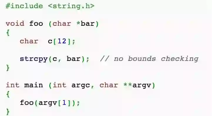 这段代码简单地调用函数foo(),并传递给它一个命令行参数作为参数(argv [1])。函数foo()先声明一个长度为12的变量c。然后它调用函数strcpy(),它将argv [1]的值复制到变量c中。正如注释所述,没有边界检查,所以这种使用strcpy可能会导致缓冲区溢出,我将在本系列的第2部分中演示这些缓冲区溢出。现在,我们只关注这个函数如何影响栈。