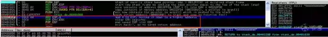 函数main()将通过将栈指针向下移动(通过将其值增加4)并清除argv [1]。然后它将通过XOR存储argv [1](EAX)的寄存器,恢复保存的EBP并返回到保存的返回地址。