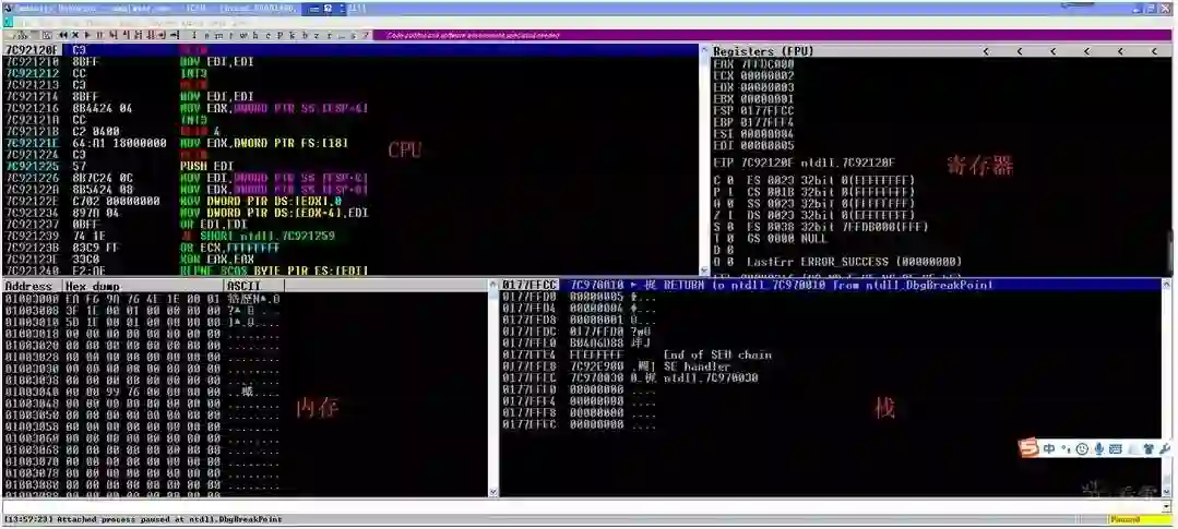 一旦你启动了一个可执行程序或者连接到Immunity中的一个进程,你应该进入CPU视图(如果没有,按Alt + C),像这样: