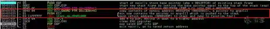 看看我已经注释过的Immunity屏幕截图 - 只需要注意现在红色框中的内容; 在函数foo()被调用之前,你会看到一个指向argv [1]的指针被推入栈。然后执行CALL指令,并将下一条指令(EIP + 4)的返回地址也推送到栈。