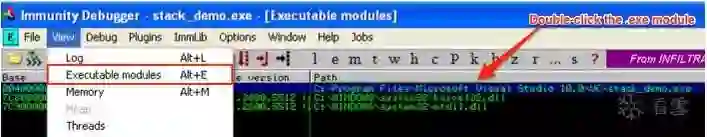 如果你想动态调试,你可能会想要在代码的相关部分插入一些断点。由于地址可能发生变化,查找我们相关程序代码的最佳方法是选择查看 - >可执行模块(或Alt + E)。然后,双击stack_demo.exe模块(或任何您命名为.exe的文件)。