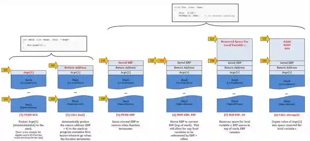 一旦函数foo()被调用,首先发生的事情是当前基指针(EBP)通过PUSH EBP指令保存到堆栈,这样一旦函数终止,main()堆栈的基础就可以恢复。