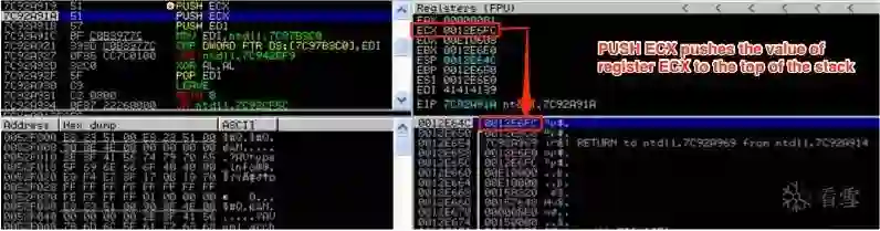 我们从第一个PUSH指令开始(PUSH ECX)。