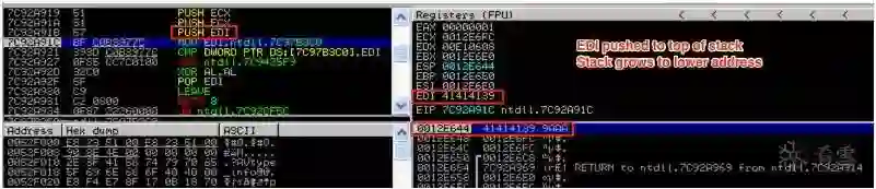 再一次,ECX(0012E6FC)的值被推到栈顶,ESP将其值再调整4个字节,正如你在上面的屏幕截图中看到的那样,最后的PUSH指令(PUSH EDI)即将执行。