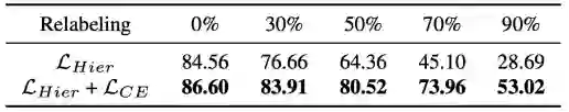 我们对比了 4 种公认的层级多粒度分类方法:HMC-LMLP[1] 、HMCN[2]、Chang et al.[3]、C-HMCNN[4]。我们汇总平均在各个数据集、不同重标记比例下各个对比方法的 OA / 结果在表 4 中:
