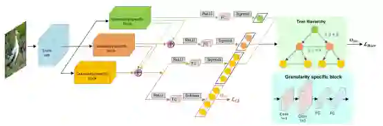 我们从三点观察出发构建我们的层级多粒度分类算法:(1)由于细粒度类别可以根据不同层次的抽象向上不停迭代归类形成树形类别结构,我们构建对应的标签关系树建模层级类别间的语义关系;(2) 基于标签关系树设计复合损失函数,使得具有不同层级粒度标注的样本在学习时可以传递层级间的知识;(3)现实世界中位于低层级的子类除了拥有自己的独特属性还会进一步继承来自父类的属性,我们首先为每个层级设置专有的特征提取层,根据主干网 络输出的特征提取各个层级相关的特征。然后我们参考深度残差网络中经典的残差连接 设计,实现为所有父类层级的特征以残差连接的方式融合到子类层级专有的特征中,进而用于当前层级类别分类的层级残差网络(HRN)。